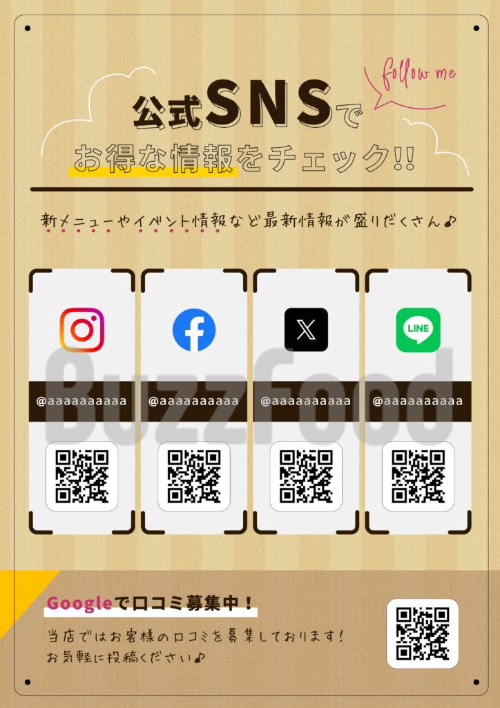 お店で運用しているSNS(インスタ・ツイッター・公式LINE・Facebook・Googleマイビジネス など)のフォロワー登録を促す店頭ポップです。