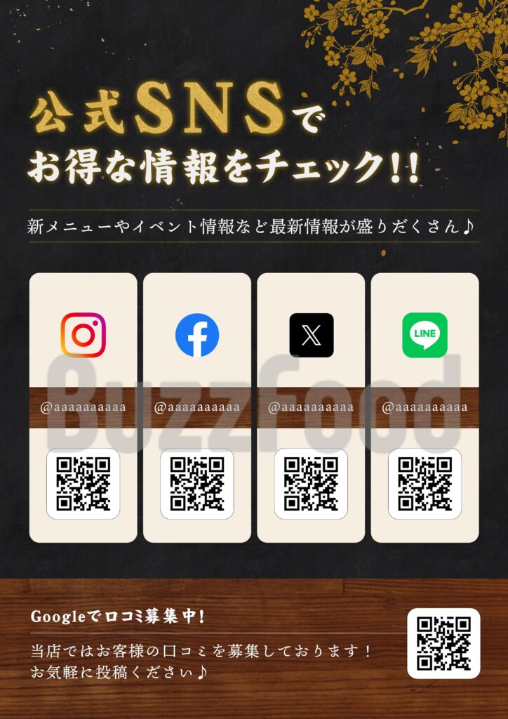 お店で運用しているSNS(インスタ・ツイッター・公式LINE・Facebook・Googleマイビジネス など)のフォロワー登録を促す店頭ポップです。