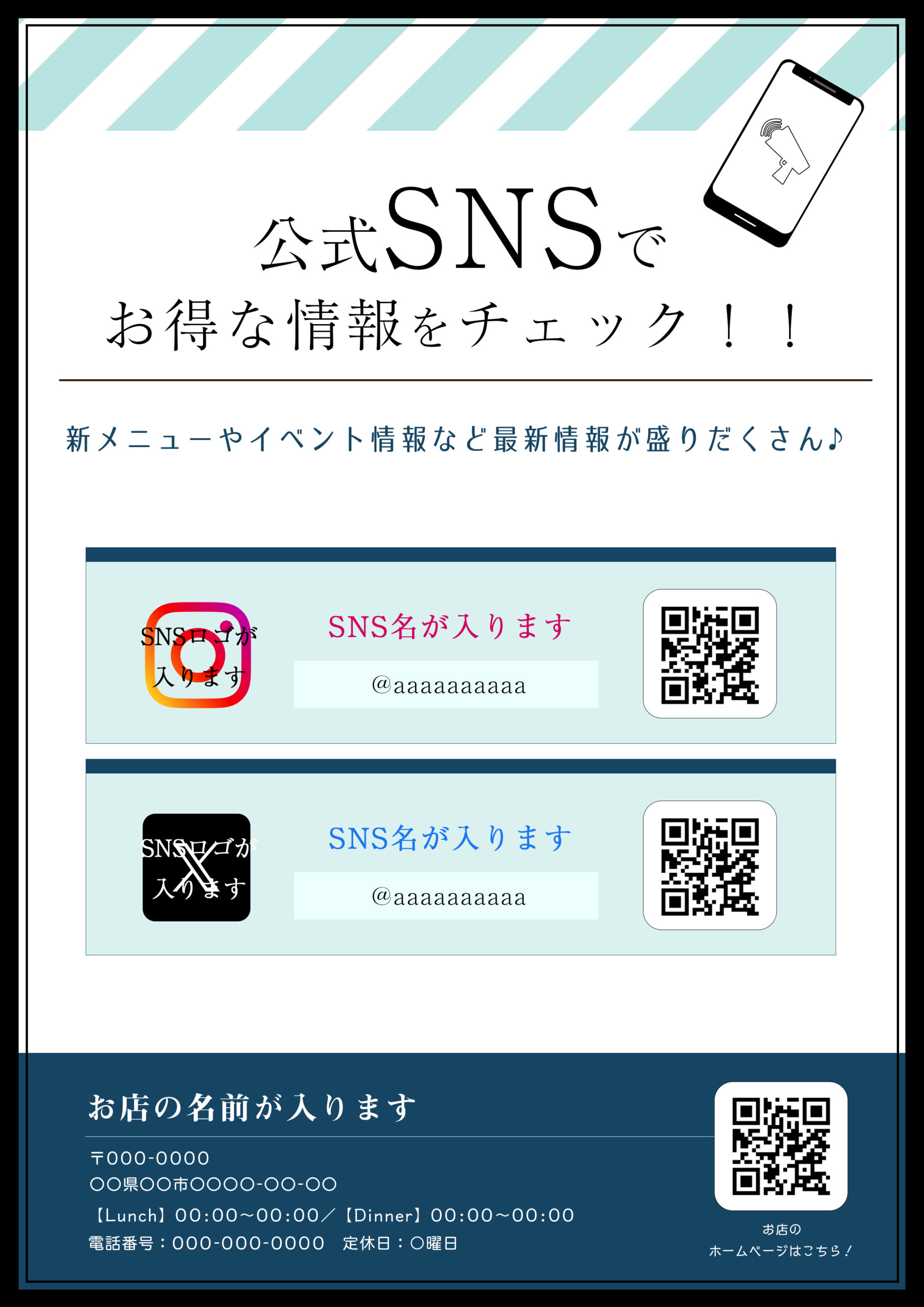 お店で運用しているSNS(インスタ・ツイッター・公式LINE・Facebook・Googleマイビジネス など)のフォロワー登録を促す店頭ポップです。2つのSNSアカウントを紹介することができます。
