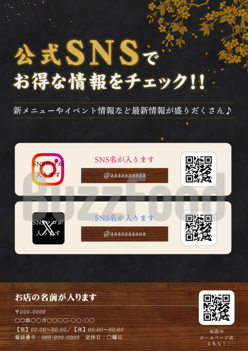 【SNS告知ポップ】Xやインスタグラムのお知らせに!和食店や居酒屋にオススメ(カラー:黒・金)縦レイアウト